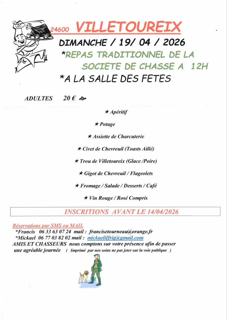 Dimanche 19 avril 2026 à 12h00, Salle des Fêtes de Villetoureix.
