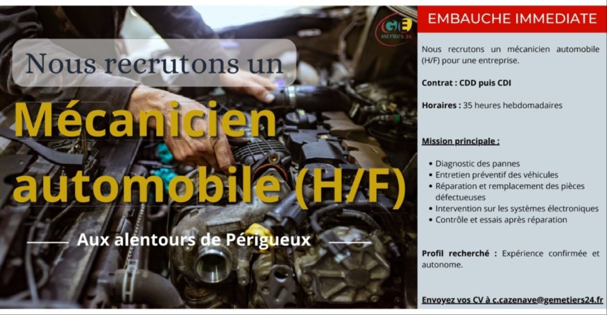 OFFRE D'EMPLOI : cherche mécanicien automobile (H/F) aux alentours de Périgueux